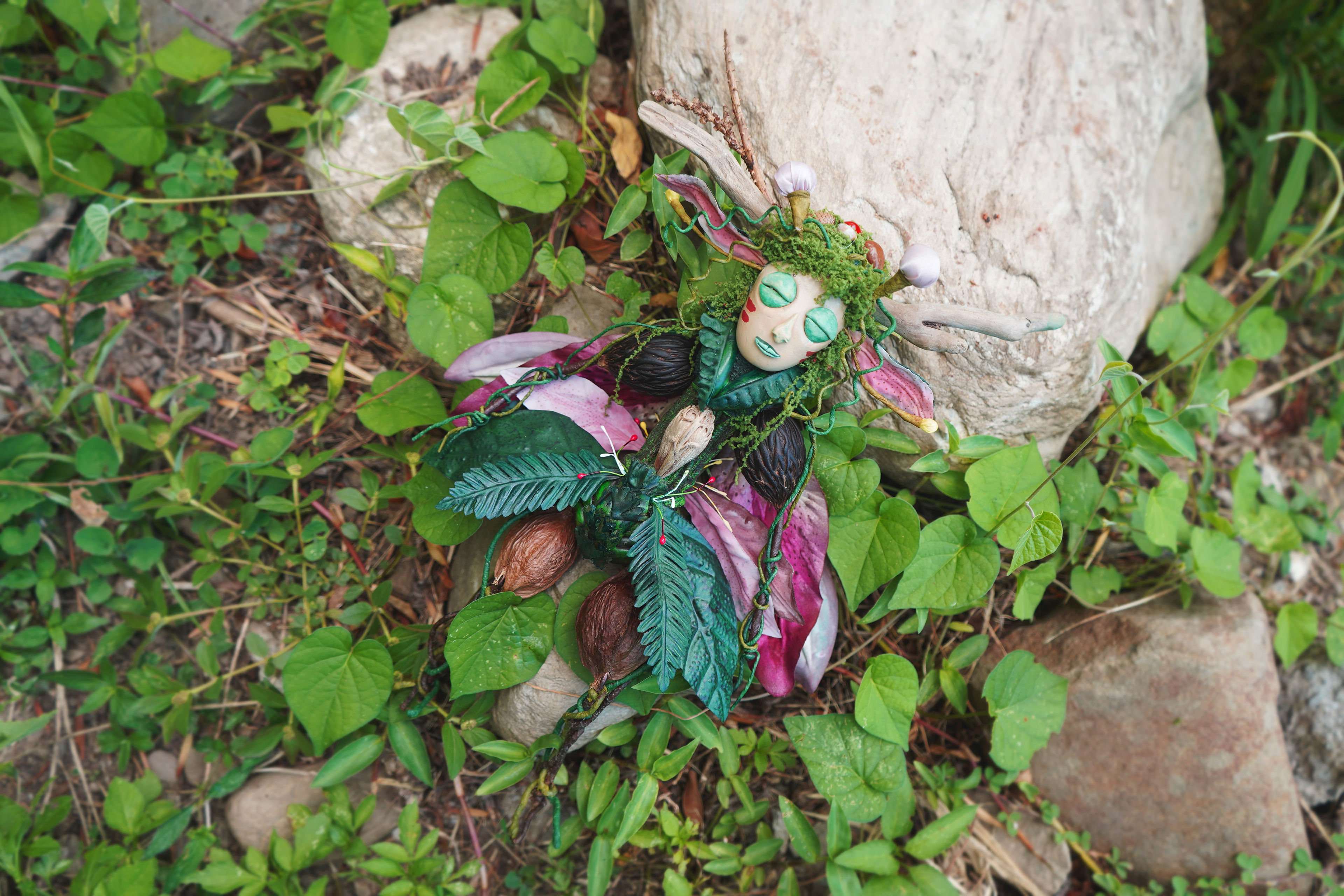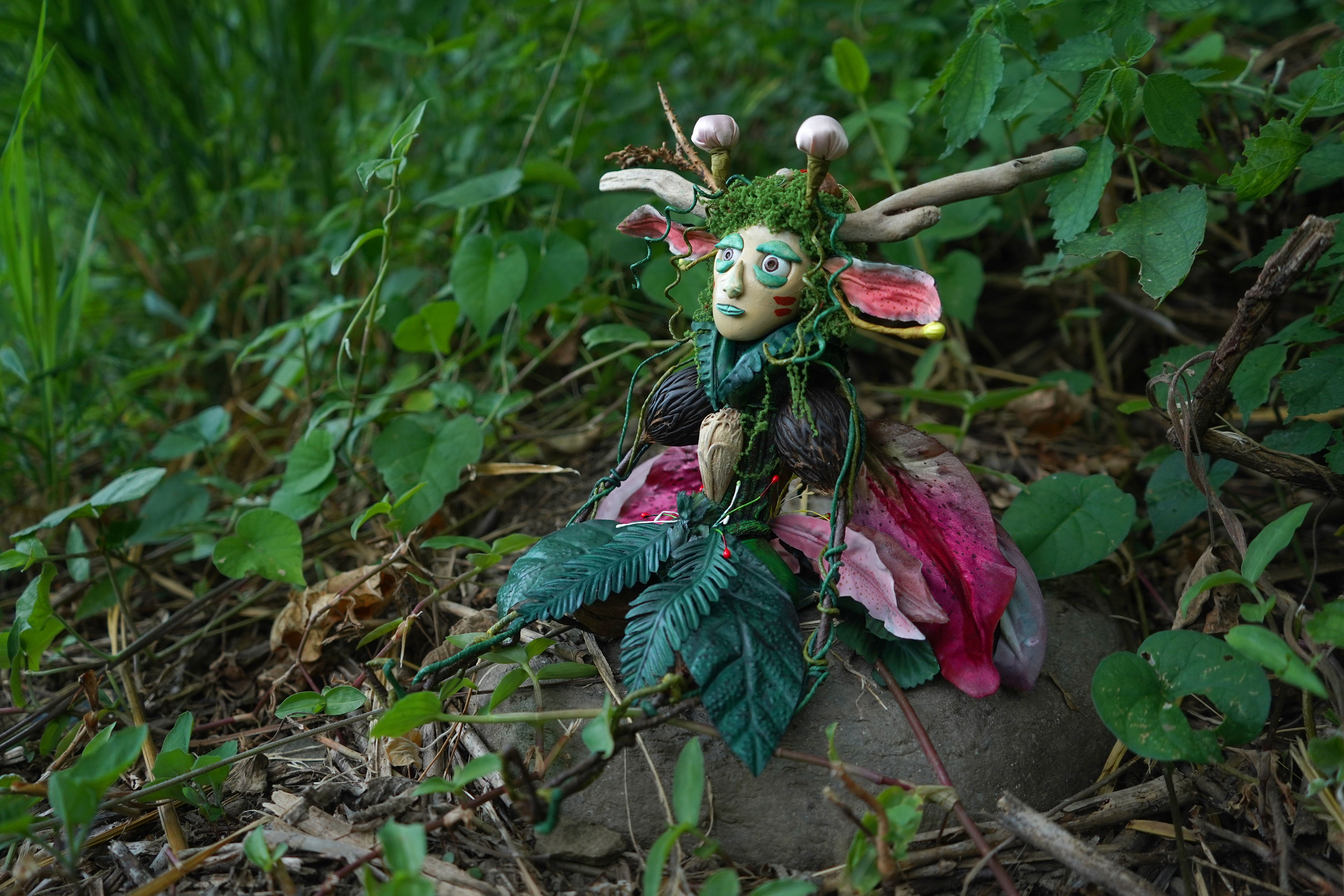 The spirit is born from plants and time, like a consciousness slowly growing from roots and soil. Its body is formed from branches, leaves, insects, and the shapes of wind. It usually rests quietly in the forest, like a tree that no one notices.