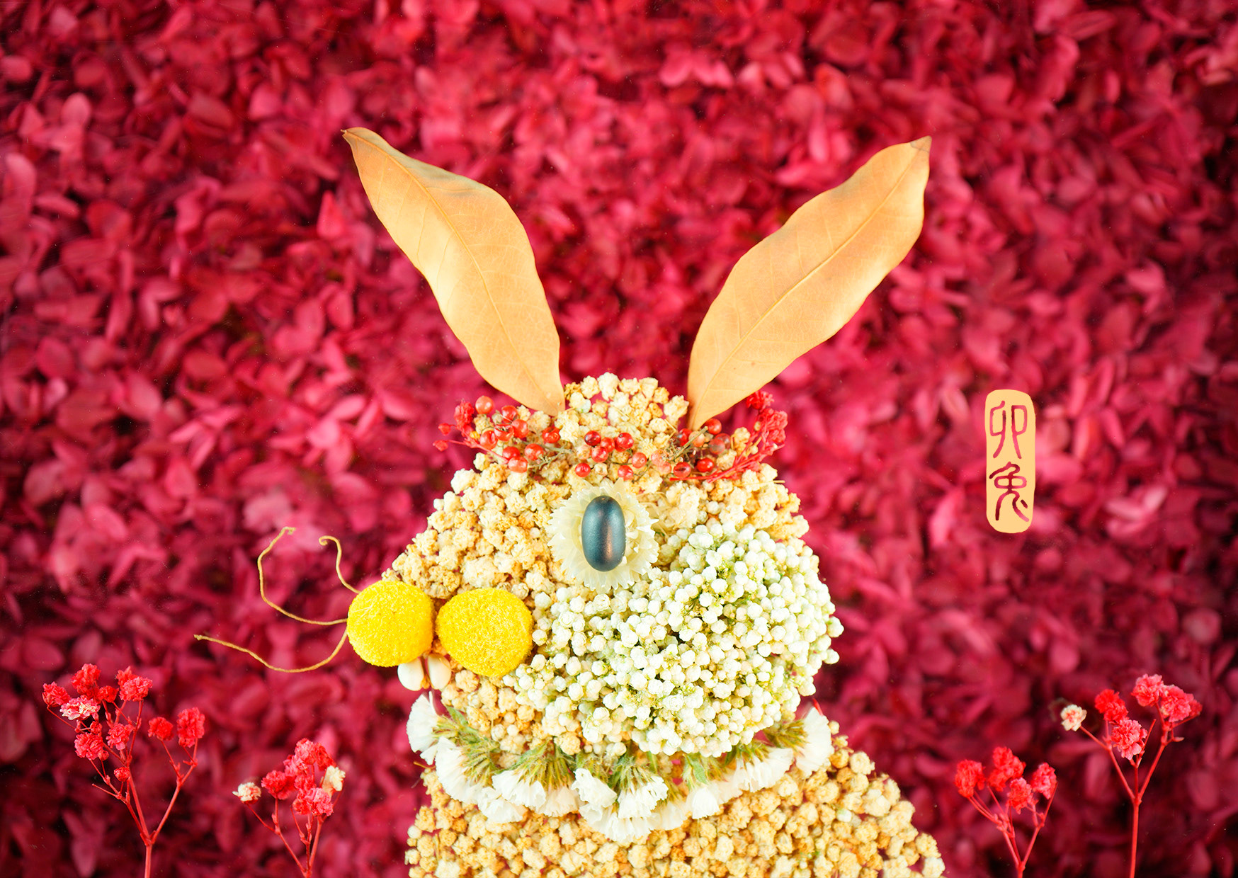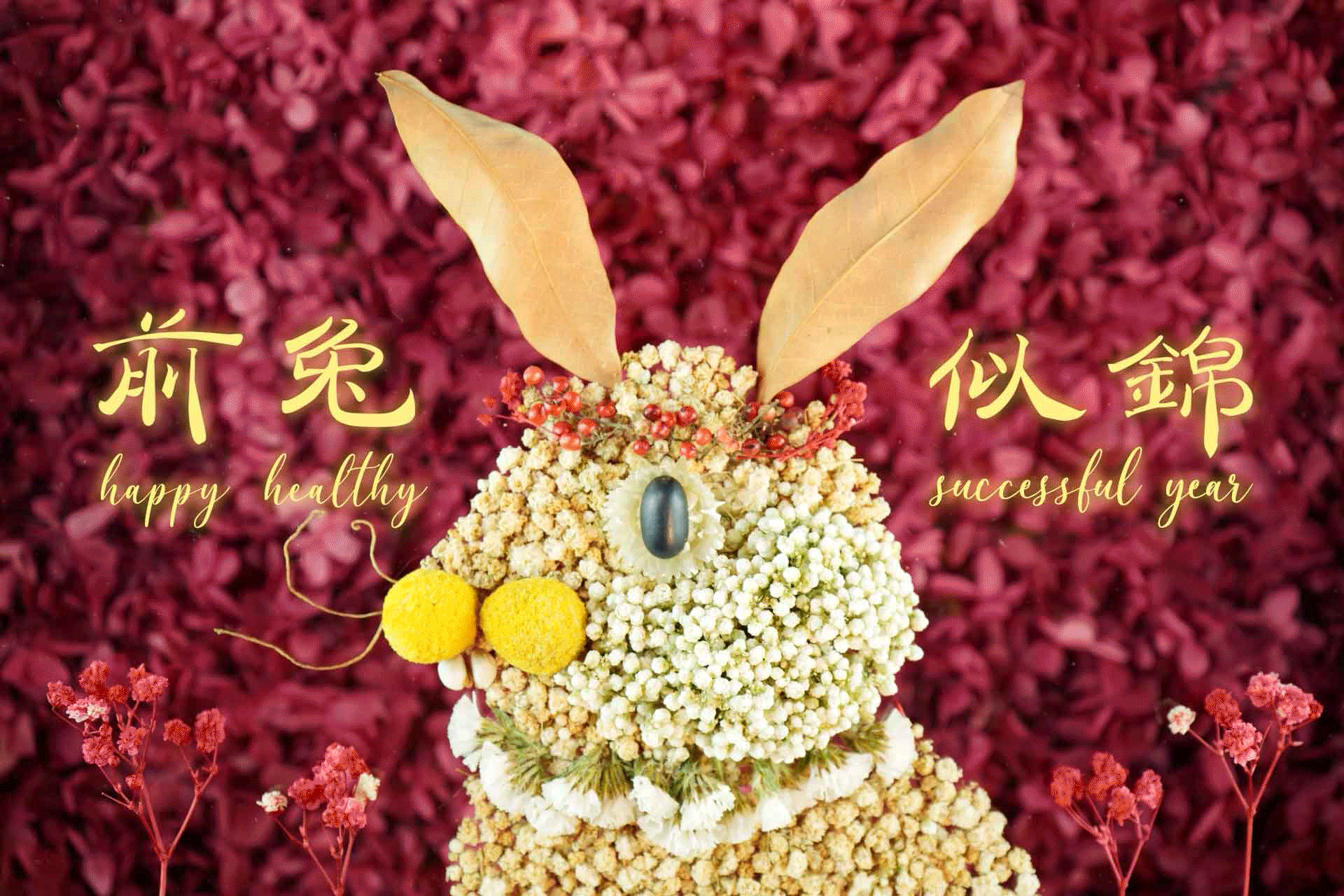 由11種乾燥永生花與葉組成的吉祥兔兔
