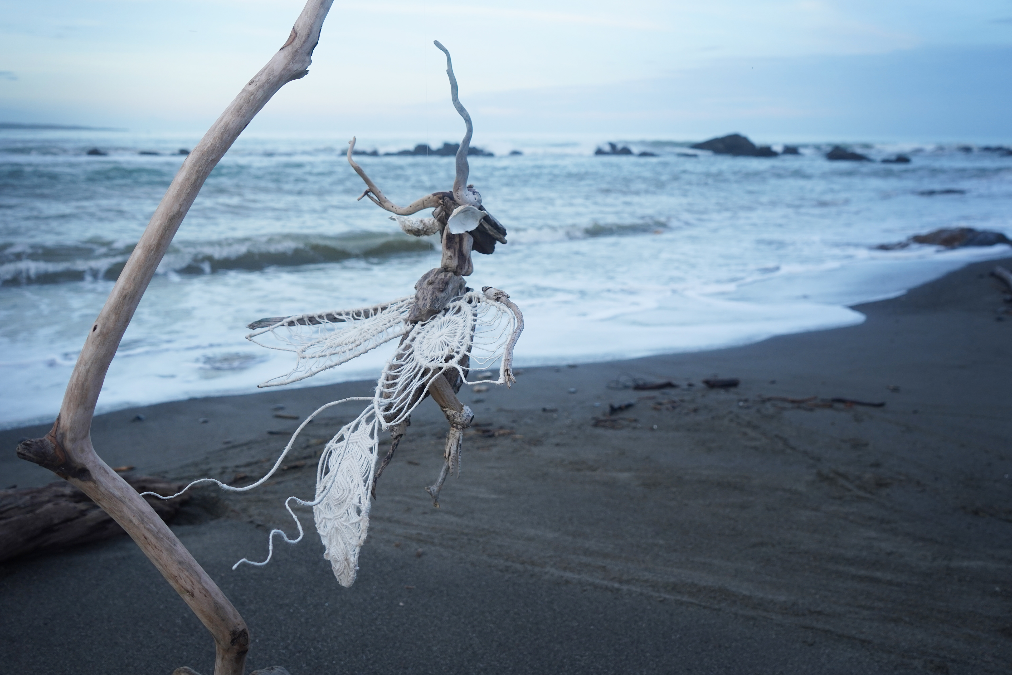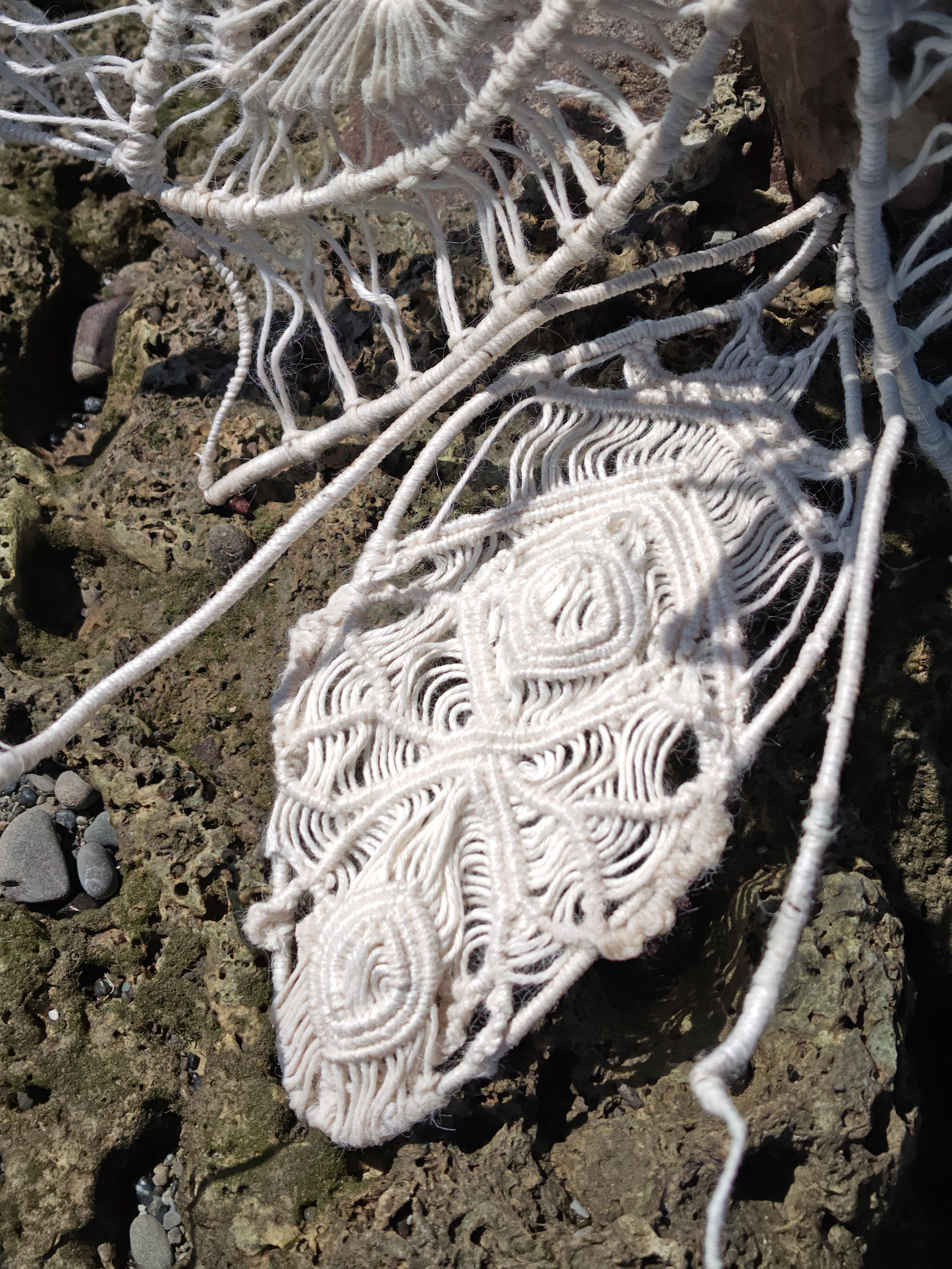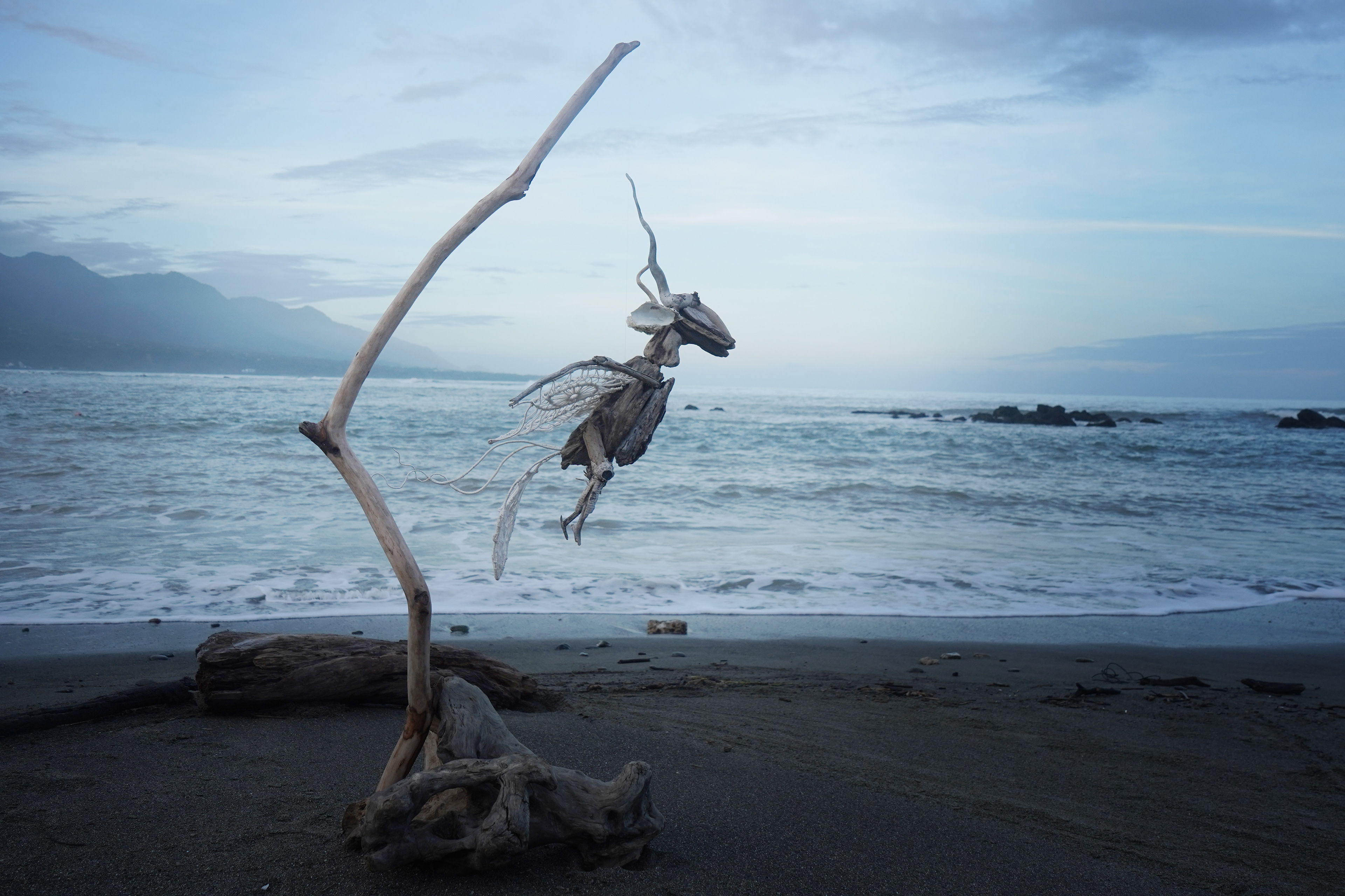 牠的身體以鋁絲與繩結結構而成,可自由擺動,模擬潛伏於夜裡的生命姿態。翅膀與尾羽以苧麻織成圓形結構,如眼睛般凝視,象徵「靈性之眼」,能看見祖靈,也能洞察人心。