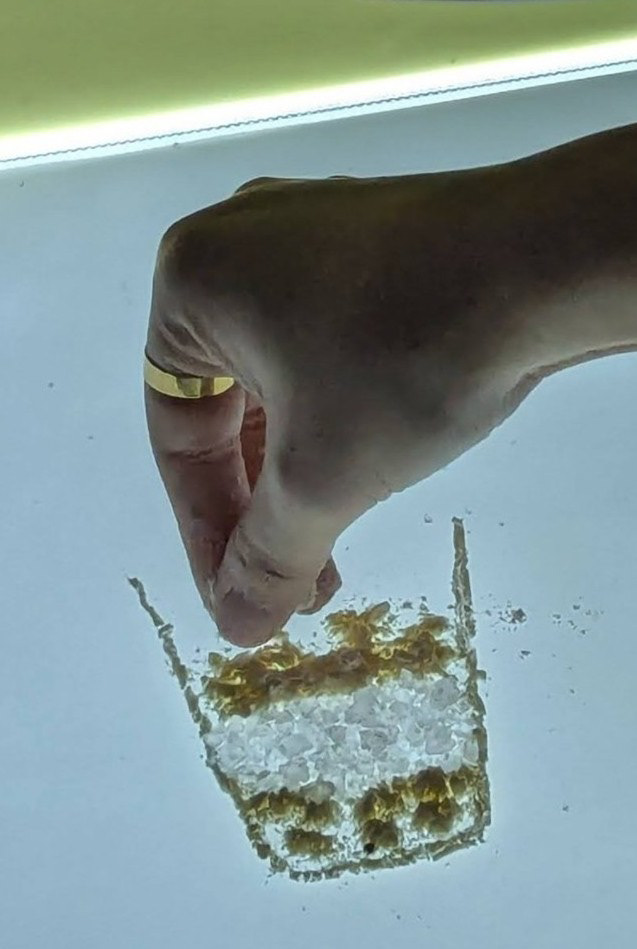 光與沙的有機質地 沙粒堆疊的厚薄,決定了光線透出的層次。這種媒材帶有一種無法完全精準控制的「有機感」,每一次的撥動都會留下獨特的紋理,創造出如夢似幻、充滿詩意與情緒渲染力的視覺氛圍。