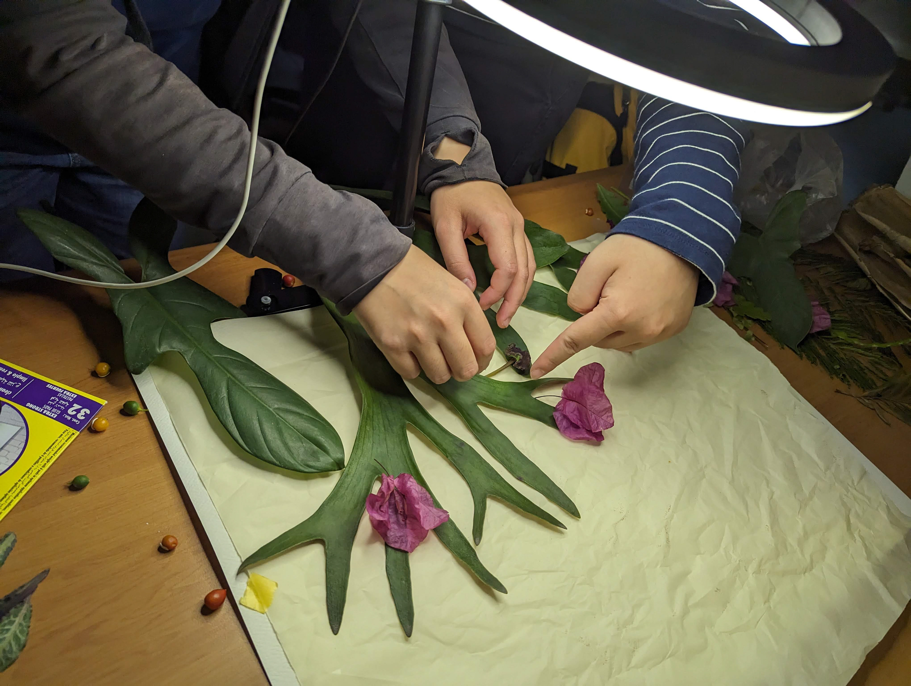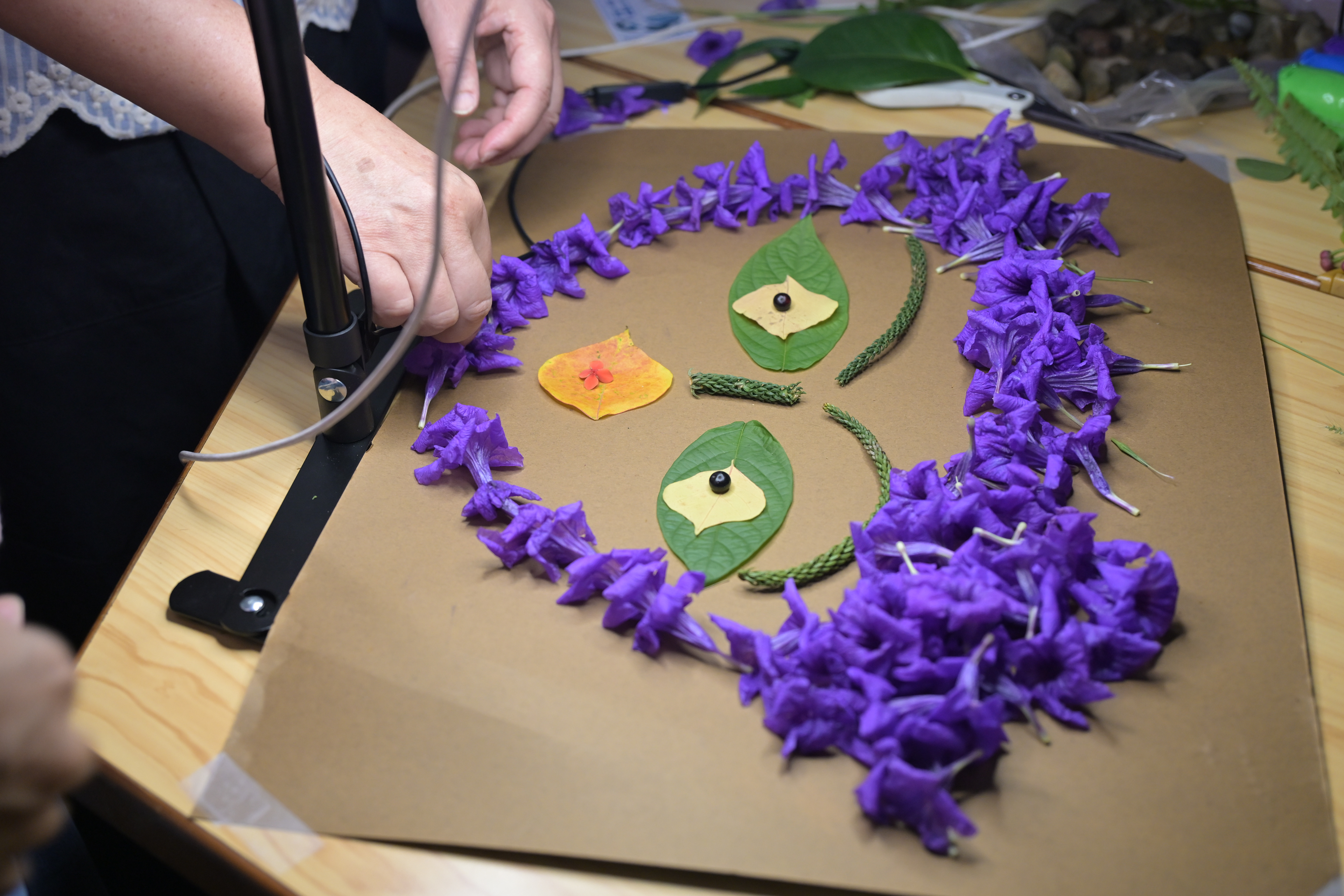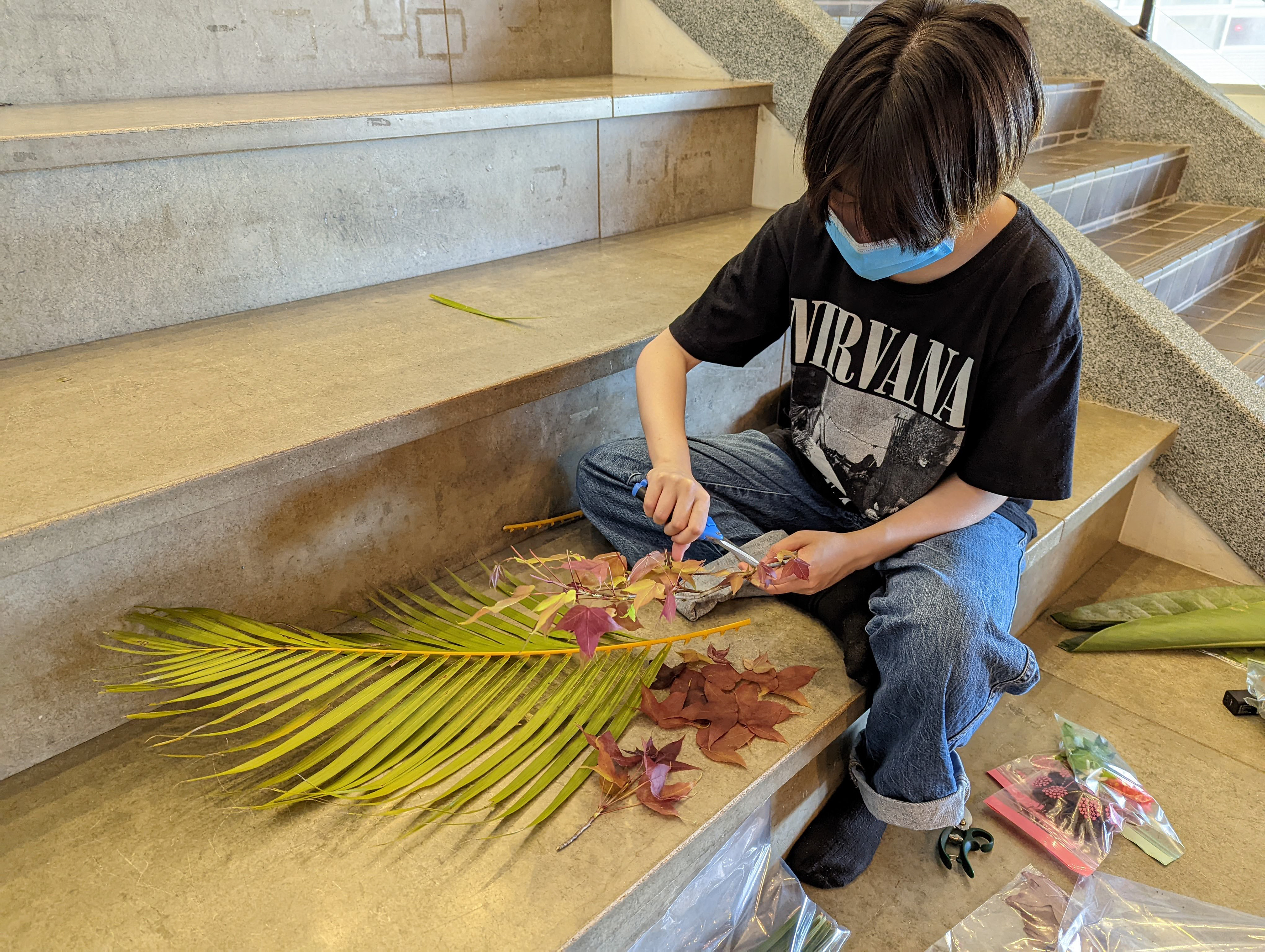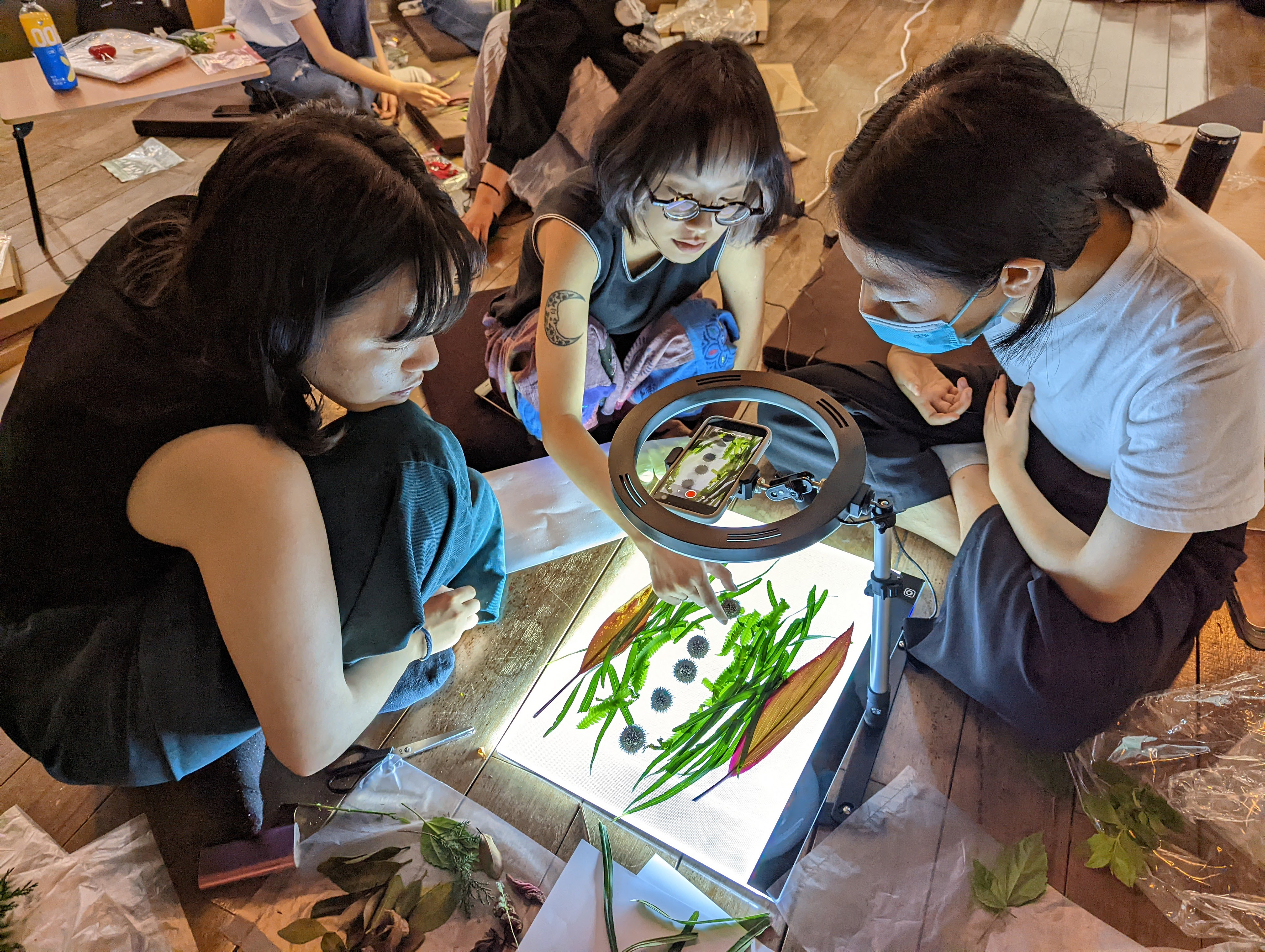 經過基礎練習後,Raito請分好組別的同學們利用休息時間討論腳本。在簡短休息過後帶著同學到戶外觀察並自由採集植物,也分享了能蒐集植物並能替植物分門別類的軟體;在歷經一番探索後,同學們滿載而歸,開始使用準備好的各式花朵、葉子及種子搭配音樂進行拍攝。就如同基礎練習時的沉迷,同學們也都非常認真投入拍攝,就算有腳本,但還是在一次次移動植物及按下快門的瞬間湧出新的想法,並展開了即興的創作;Raito導演除了四處穿梭給予指導、欣賞讚嘆同學們帶來了許多漂亮特別的各式植物,也不時提醒一股腦埋頭創作的大家趕快拍攝收尾,因為時間實在有限啊!