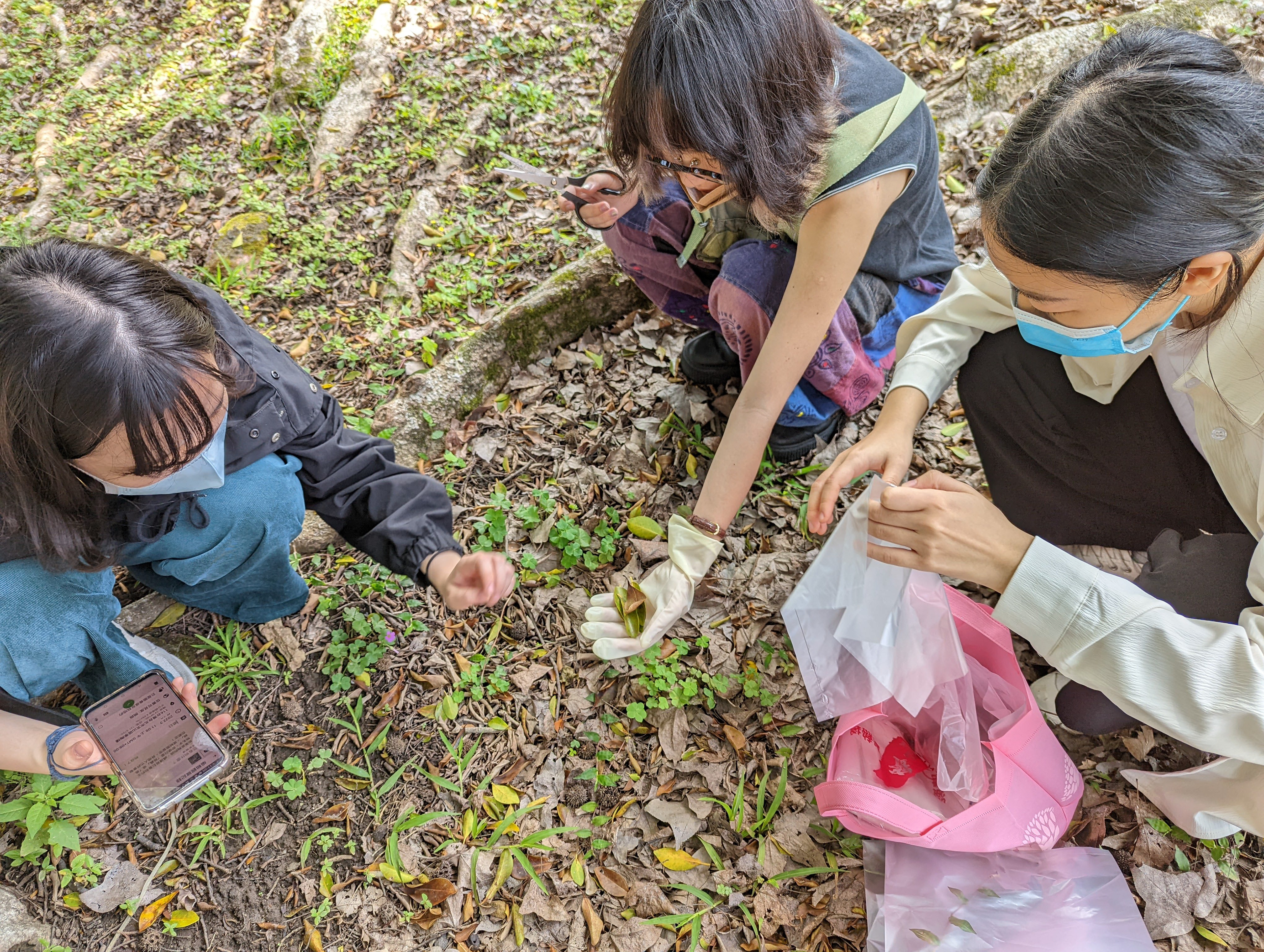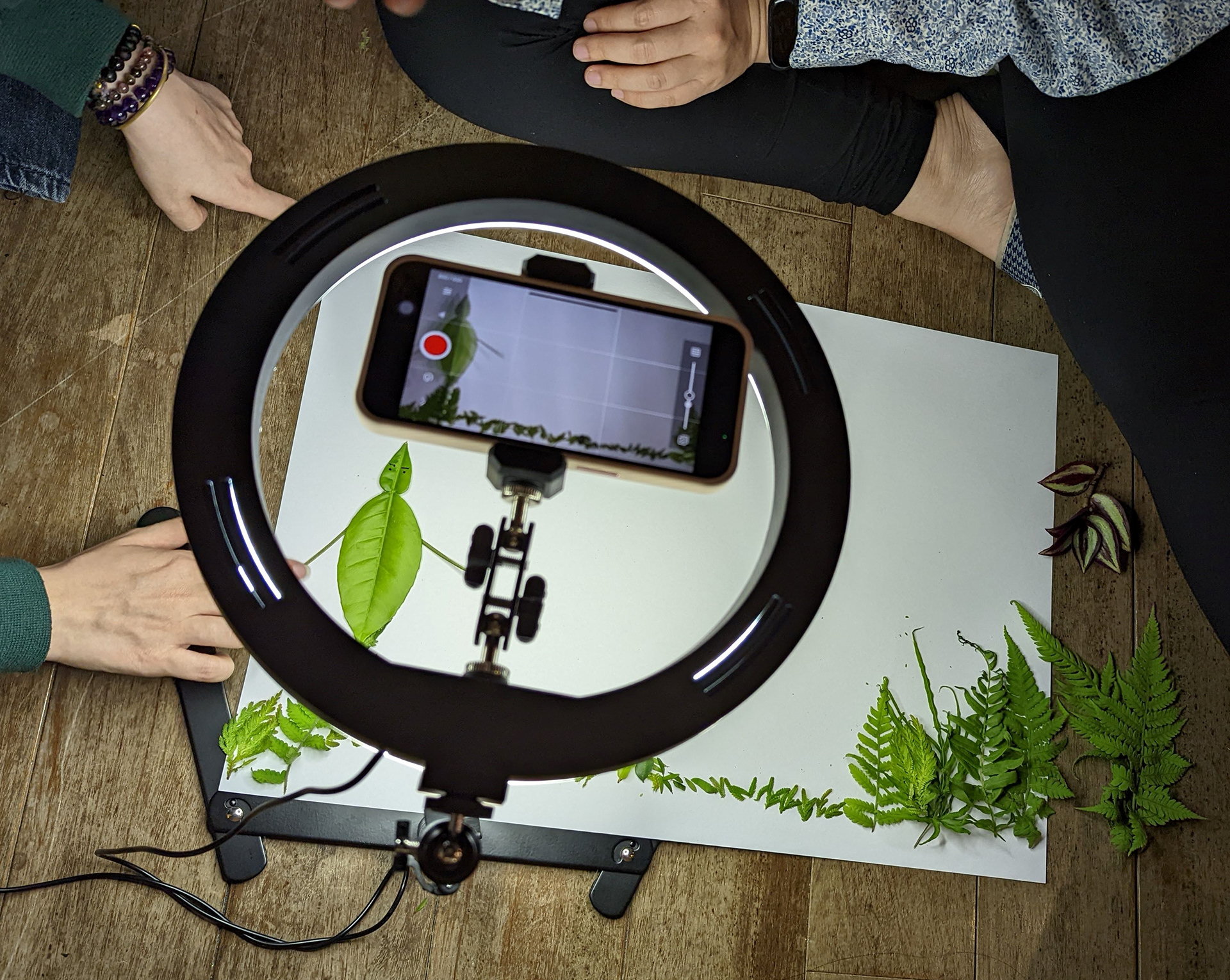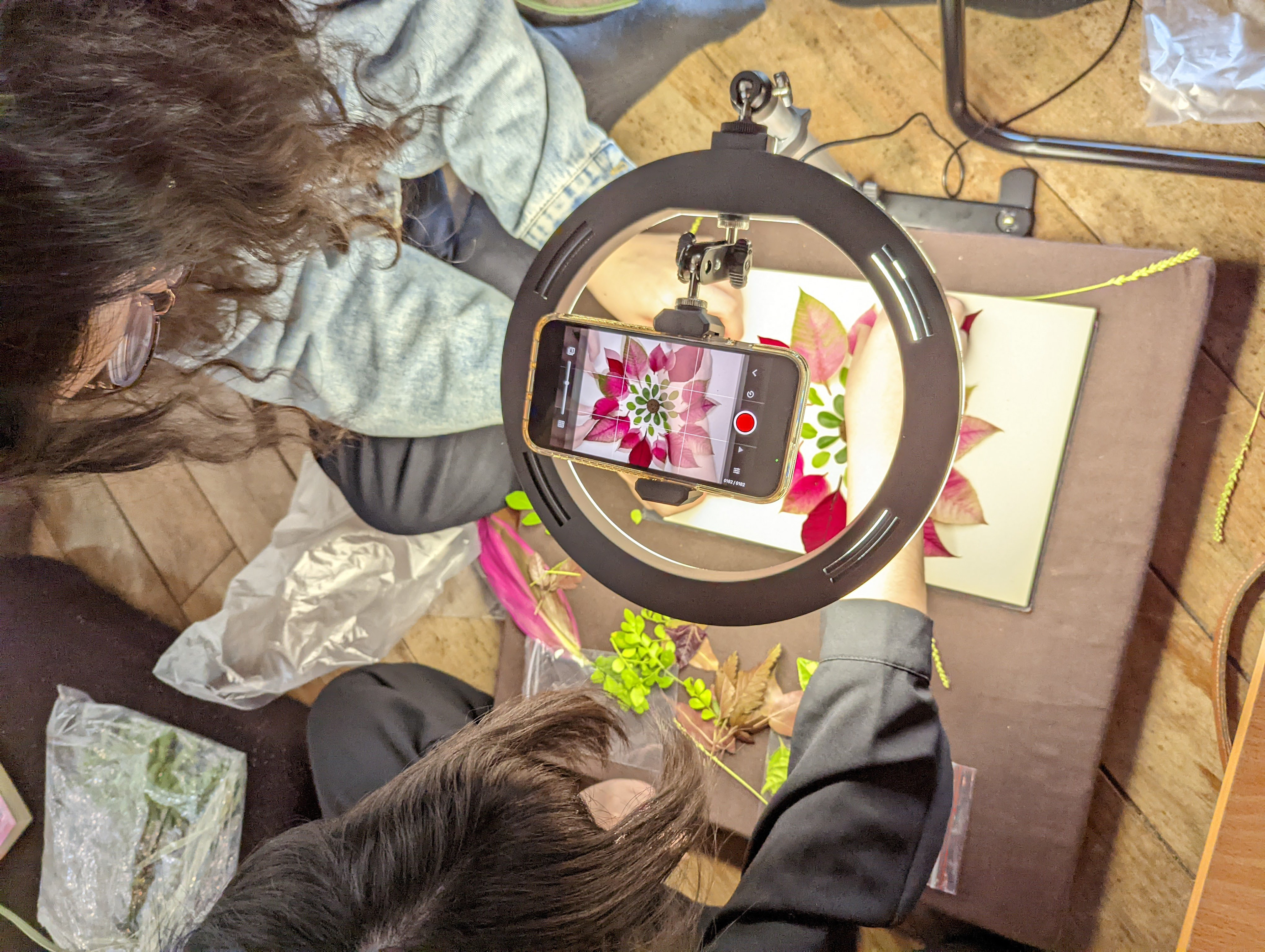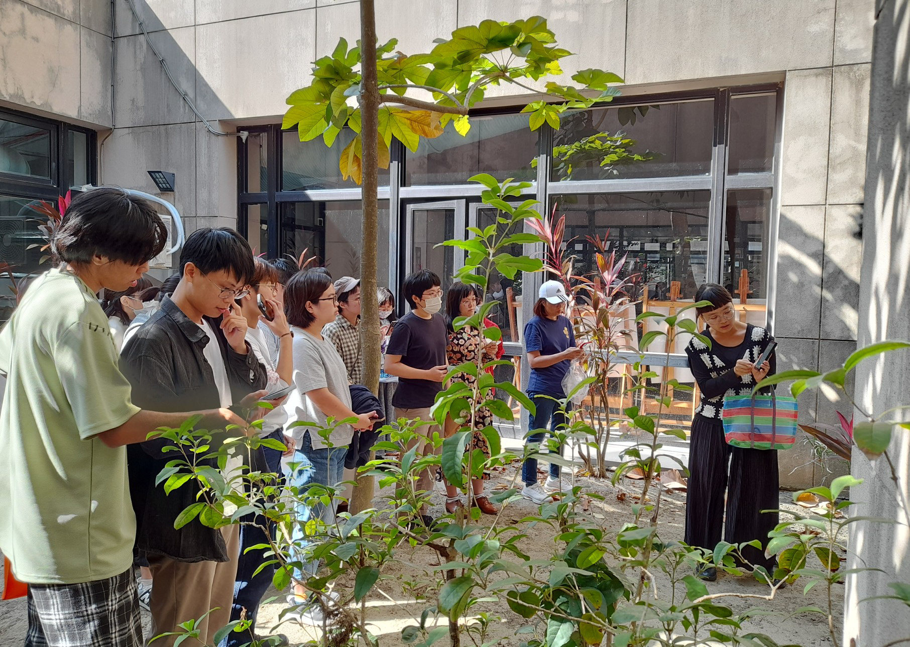 經過基礎練習後,Raito請分好組別的同學們利用休息時間討論腳本。在簡短休息過後帶著同學到戶外觀察並自由採集植物,也分享了能蒐集植物並能替植物分門別類的軟體;在歷經一番探索後,同學們滿載而歸,開始使用準備好的各式花朵、葉子及種子搭配音樂進行拍攝。就如同基礎練習時的沉迷,同學們也都非常認真投入拍攝,就算有腳本,但還是在一次次移動植物及按下快門的瞬間湧出新的想法,並展開了即興的創作;Raito導演除了四處穿梭給予指導、欣賞讚嘆同學們帶來了許多漂亮特別的各式植物,也不時提醒一股腦埋頭創作的大家趕快拍攝收尾,因為時間實在有限啊!
