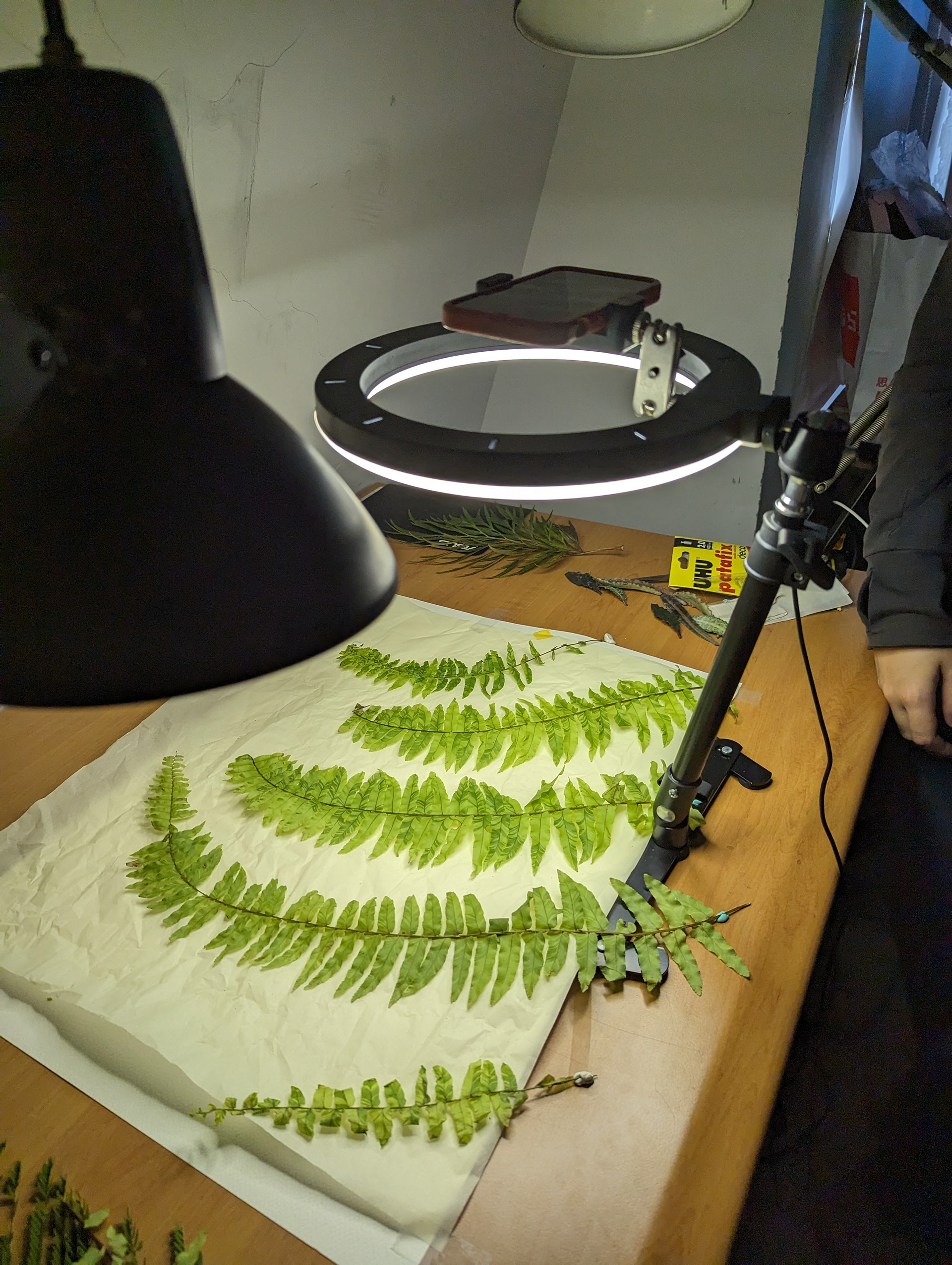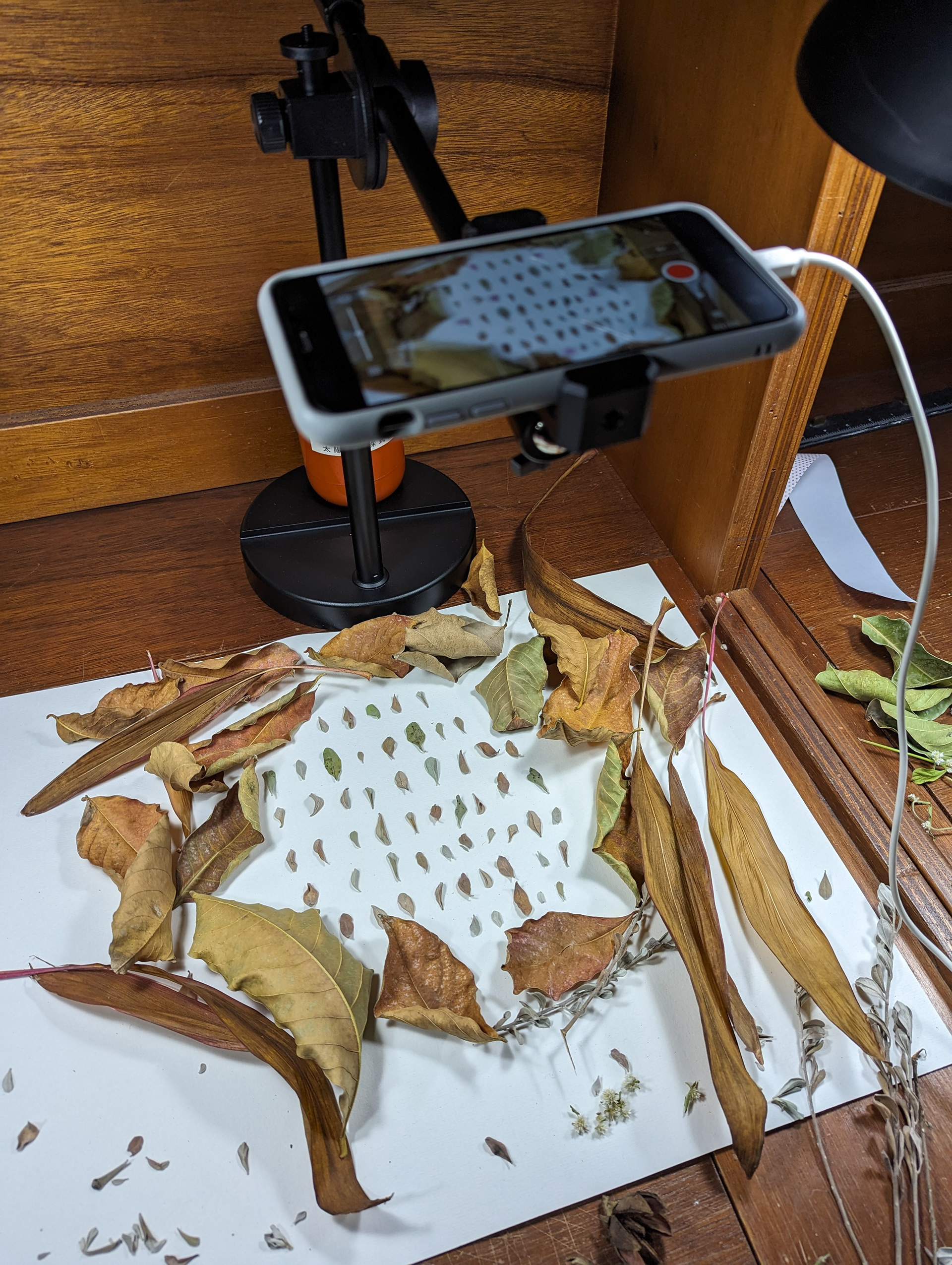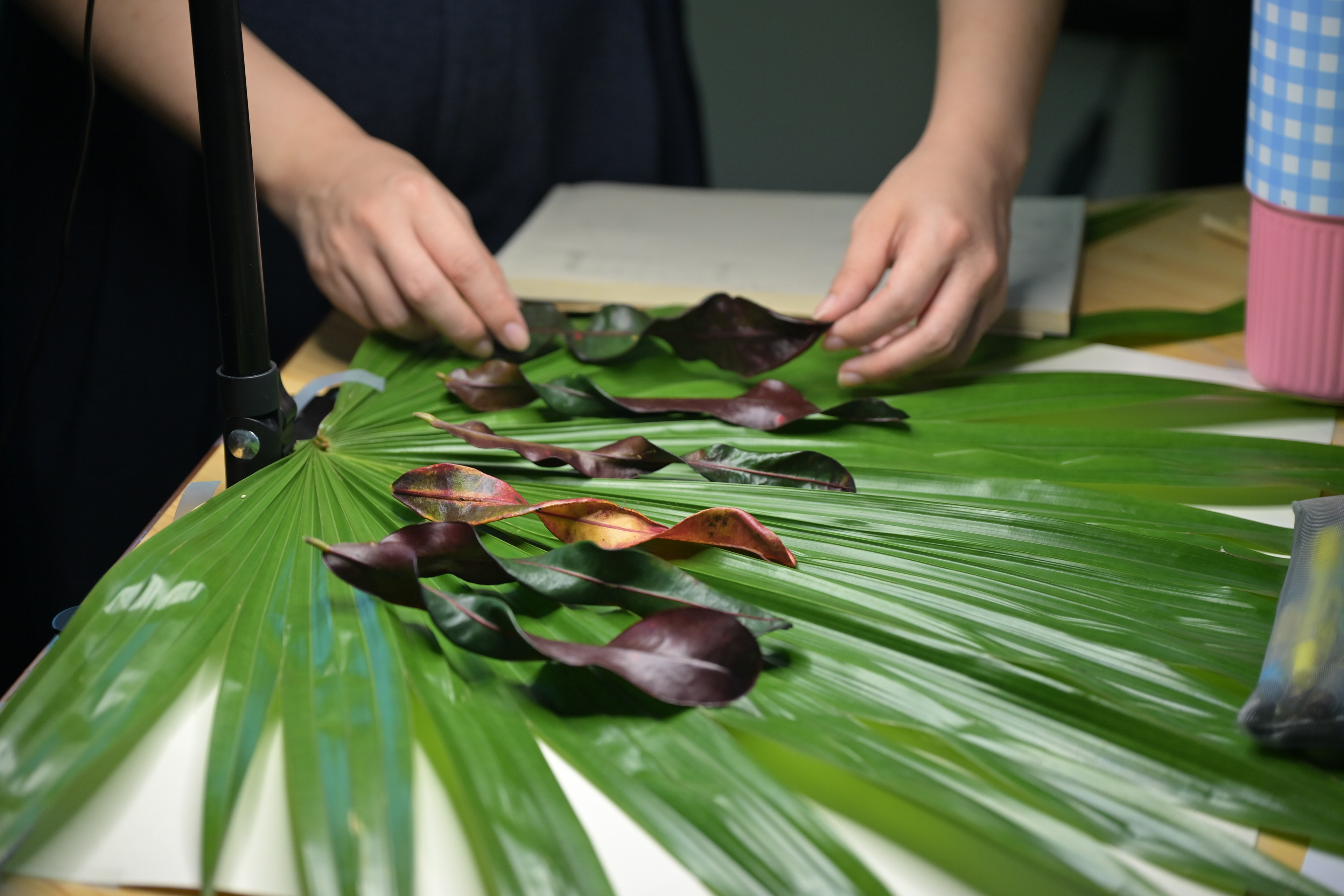 由於植物是有生命的、採摘下來不管是花朵、葉片都會凋萎,Raito也是在此下了不少工夫,除了找專門收集存放種子的工作室有現成的可使用外,有些部分他也會自己來。花朵及葉片收集下來以後會稍微放乾,並用密封袋收集起來開始測試植物的耐放程度;而立體的花朵為了適合平面拍攝,也必須將其撥平;另外也可以使用已經加工過的乾燥花、永生花甚至是花草茶包,不管植物變成了什麼形式,都可以成為創作的一部分。就是先有了這些前期測試,才可避免開始創作時的手忙腳亂。